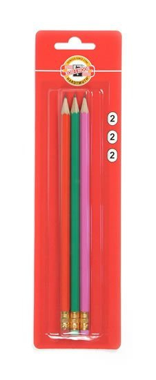 Šestihranné tužky v dřevěném plášti s grafitovým jádrem v gradaci 2/HB. Tužky jsou ve třech odstínech povrchové úpravy a mají 3 odstíny gumotypů, balené po 3 ks (mix) v blistru. Hodí se pro univerzální použití.