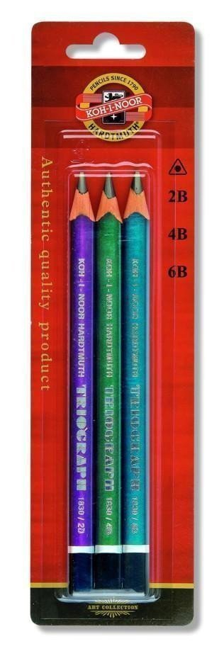 Trojhranné grafitové tužky TR-10,4 mm v dřevěném plášti, v v gradaci 2B, 4B, 6B v metalickém provedení. Ergonomický trojhranný tvar umožňuje optimální držení a vedení tužky. Balené po 3 ks ve 3 gradacích v blistru. Jsou vhodné jak pro školní použití, umělecké kreslení i pro univerzální použití. Zvláště vhodné pro dyslektiky a dysgrafiky.