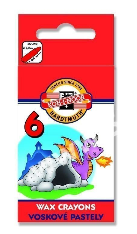 <p>souprava voskovek určených pro školní, aranžérské a umělecké kreslení – 6 ks souprava. Souprava 6 kusů kulatých voskovek se zašpičatělým koncem o rozměrech O 7,8 mm, délka 80 mm, kde každá voskovka je obalená zavinovacím štítkem modro-bíle pruhovaným se žlutým textem WAX CRAYON. Voskovky jsou vložené hroty k eurozávěsu, do kartonové potištěné krabičky s motivem draka. Rozměr krabičky 113 x 51 x 9 mm. S ohledem na duševní a fyzické schopností dítěte může být výrobek vkládán do úst a ukousnut/odlomen. Dítě ukousnutou/odlomenou část spolkne. Spolknutá část projde trávicím traktem bez zjevného ovlivnění traktu.</p>
