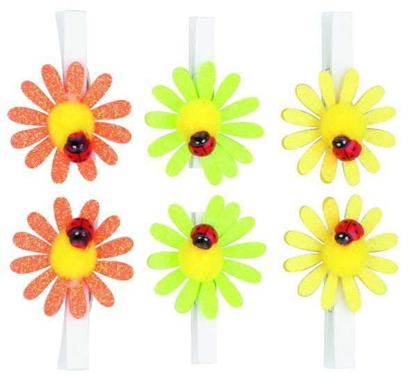 Kytičky s beruškou v jarních barvách s jemným třpytem. Díky kolíčku se dají všestranně použít, například krásně ozdobí jarní věnce.