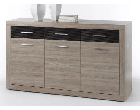 Dubový dekor dřeva doplňují originálně strukturované povrchy tmavě šedé pinie, které propůjčují komodě nezaměnitelný vzhled.