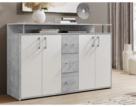 Úložná komoda v imitaci šedý beton/bílá je navíc doplněna horní policí s praktickou širokou přihrádkou, kam si můžete odložit například věci každodenní potřeby.