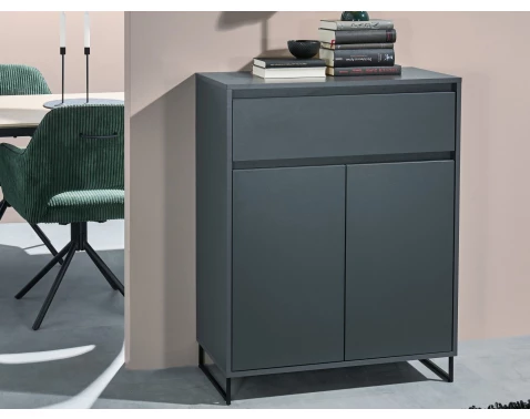 Komoda se šuplíkem z řady Cologne má šířku 80 cm a je vyrobena v antracitově šedém provedení. Moderní minimalistický styl dotváří černá kovová podnož.