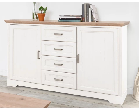 Komoda se zásuvkami o celkové šířce 164 cm v provedení bělená pinie s dubovým dřevodekorem z kolekce Jasmin - nábytek v moderním venkovském stylu s důrazem na detail navazuje na tradici útulně zařízeného domova a přímo láká k tomu, abyste si vytvořili prostředí, kde se budete cítit dobře. Kombinujte tak jednotlivé elementy z této řady a vytvořte si stylový rustikální interier s nádechem tradice.