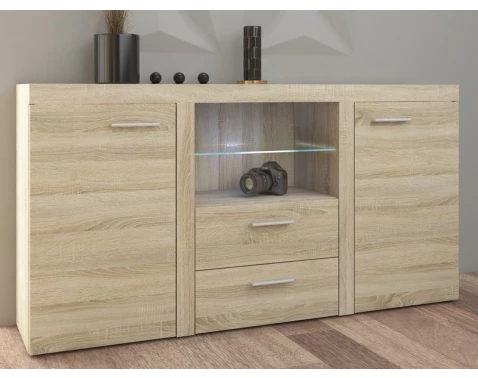 Komoda v trendovém stylu nabízí praktické úložné prostory i otevřené přihrádky pro umístění dekoračních předmětů nebo elektroniky, navíc se zásuvkami uprostřed.