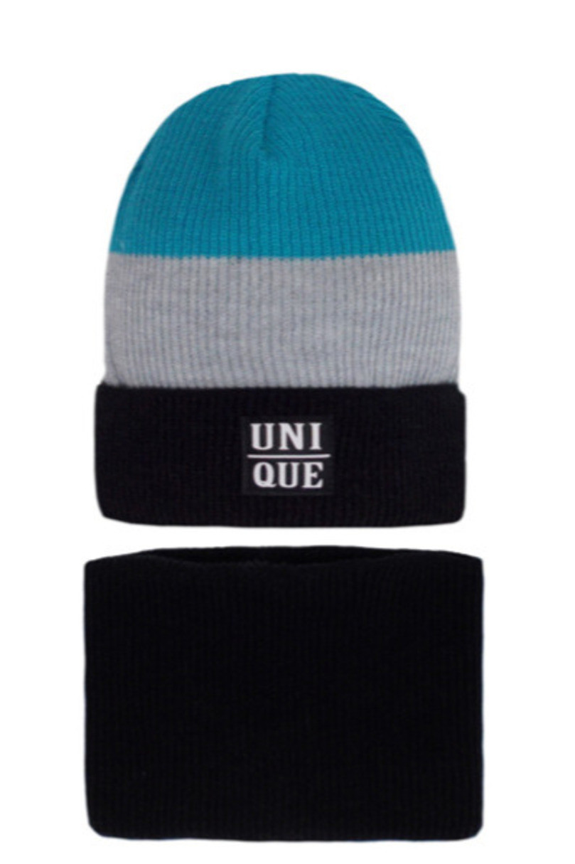 Barevně pruhovaný chlapecký komplet: subójy klobouk, ohrnutý + komín .