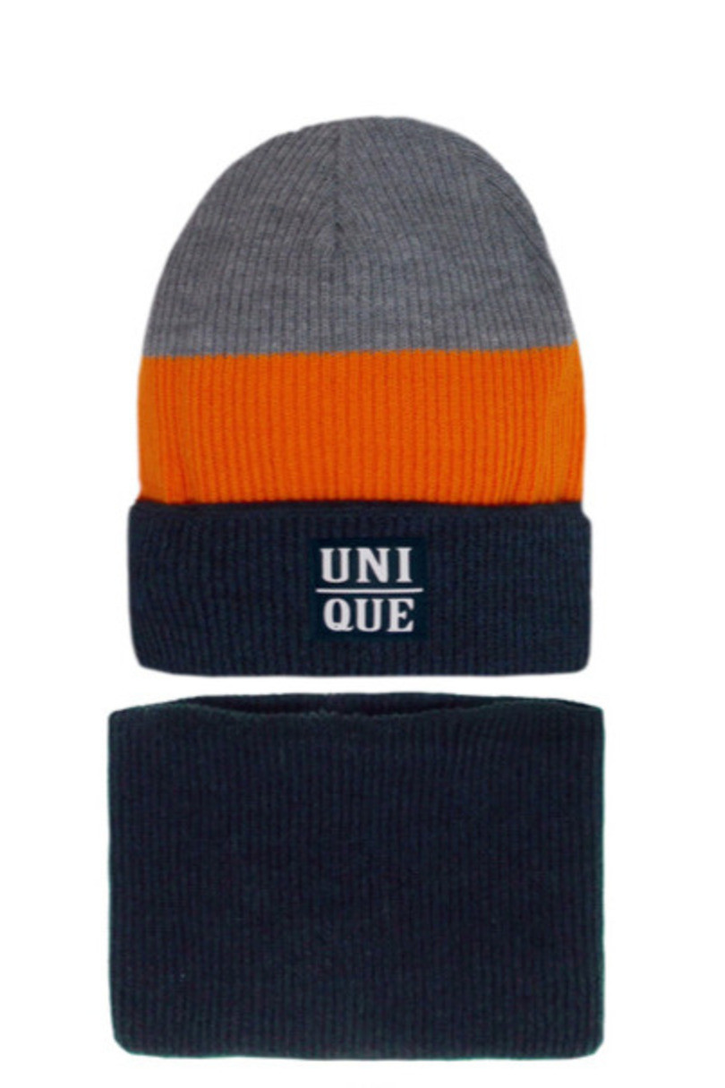 Barevně pruhovaný chlapecký komplet: subójy klobouk, ohrnutý + komín .