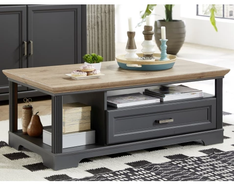 Konferenční stolek s úložným prostorem v grafitovém odstínu a dubovým dekorem z kolekce Jasmin pro útulný venkovský styl.