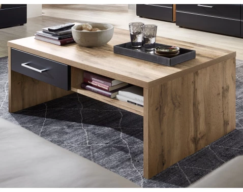 Moderní konferenční stolek se zásuvkou a přihrádkou v kombinaci černá/dub wotan vytváří skvělý kontrast a zaujme na pohled.