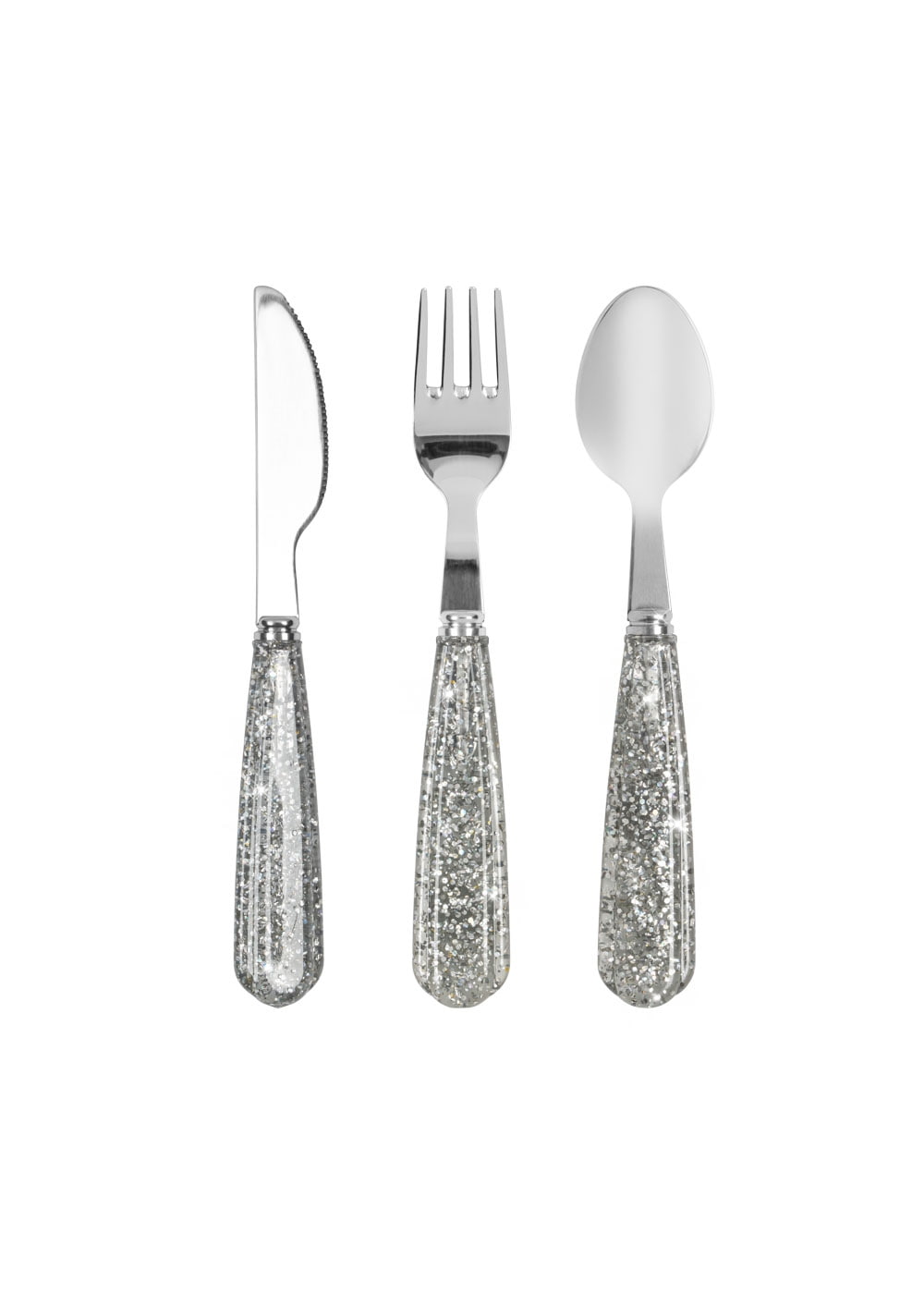 Třpytivá sada příborů v stříbrné s modrými odlesky nebo růžové variantě zajisté osloví především holčičky. Díky originálnímu balení je tak krásným dárkem k jakékoli příležitosti. Příbor má robustní konstrukci, čímž zajišťuje pohodlný úchop. Vyroben je z nerezové oceli, která je odolná a zdravotně nezávadná.