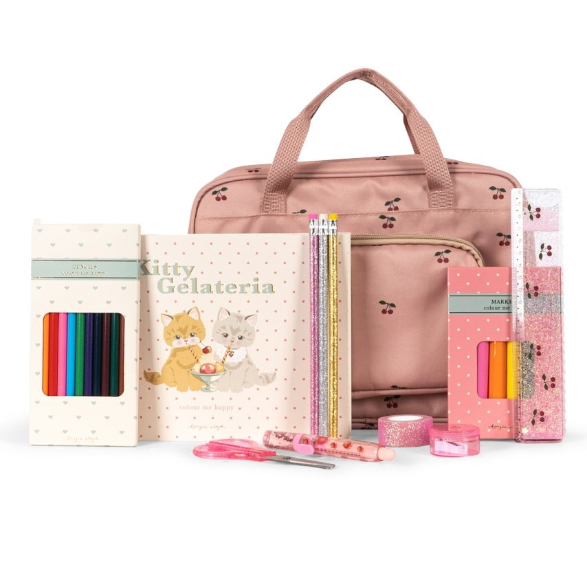 Praktická cestovní taška s ikonickým motivem třešní obsahuje vše potřebné pro tvoření a zábavu na cestách a je navržena tak, aby perfektně seděla na horní část příručního kufru a usnadnila tak její přenášení. V přední části je ještě kapsa na další potřeby nebo malou svačinku.