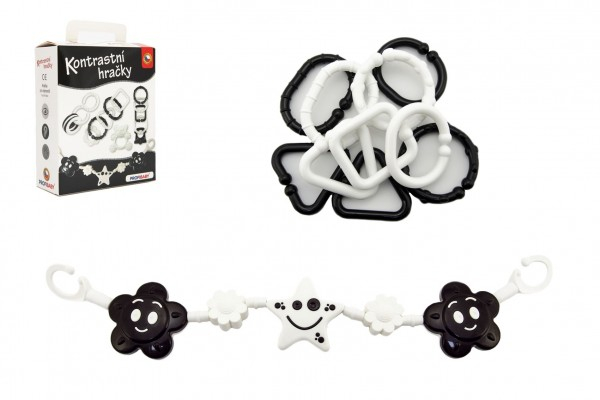 Set kontrastních hraček v dárkové krabičce v černobílém provedení. Tato barevná kombinace dokonale stimuluje smysl zraku u dítěte, které dosud nerozlišuje barvy. Chrastítka jsou tvarově koncipována tak, aby byla snadno uchopitelná dětskou rukou – při hře si dítě zároveň cvičí uchopovací reflex. Samozřejmostí ve výrobě je použití zdravotně nezávadných materiálů, splňujících náročné hygienické normy. Chrastítka jsou stálobarevná, bez ostrých hran, které by mohly dítěti při hře ublížit, a bez uvolnitelných malých částí, u nichž hrozí odlomení a následné případné vdechnutí či spolknutí dítětem.Balení obsahuje 4 výrobky v černobílé kombinaci. Vhodné pro děti od narození