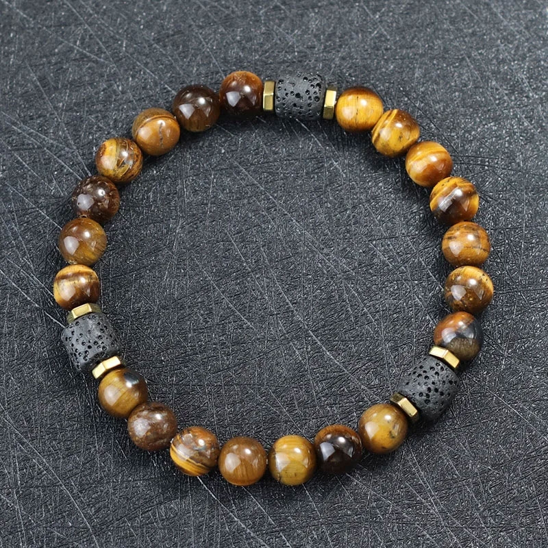 Tento pánský korálkový náramek, zdobený kameny tygřího oka a lávového kamene, je vyjádřením mužnosti a odvahy. Jeho zemitě teplé barvy a robustní textura jsou výrazem síly a stability, což z něj dělá nejen módní doplněk, ale i amulet. Tygří oko, známé svými ochrannými vlastnostmi a schopností přinášet štěstí, je ideální pro muže, kteří čelí každodenním výzvám. Lávový kámen pak přidává element odolnosti a zároveň podporuje zklidnění a regeneraci. Korálky jsou navlečeny na elastickém lanku, což zajišťuje pohodlné nošení a snadné nasazování. Délka náramku je standardních 20 cm, což odpovídá většině pánských zápěstí, a jeho pružnost umožňuje dostatečnou flexibilitu pro každodenní aktivní používání. Tato praktická vlastnost činí náramek ideálním pro muže, kteří upřednostňují šperky bez komplikovaných zapínání. Náramek je také skvělou volbou pro muže, kteří hledají šperk s hlubším významem. Může sloužit jako osobní talisman nebo jako stylový doplněk k ležérnímu i formálnímu outfitu. Jeho univerzálnost a mužný vzhled z něj dělají perfektní dárek pro muže všech věkových kategorií, ať už pro partnera, otce, nebo dobrého přítele.