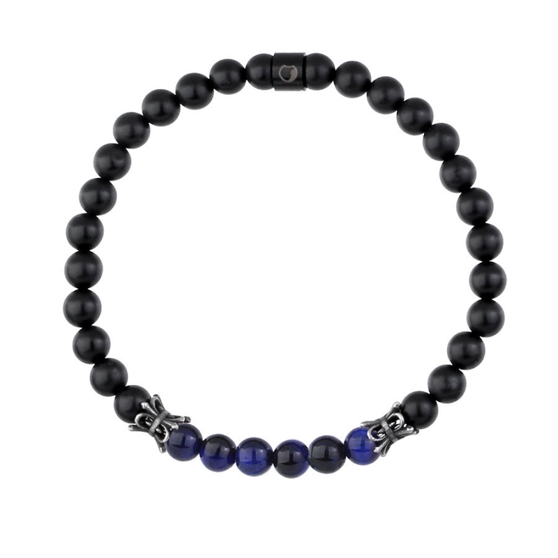 Ozdobte své zápěstí tímto pánským korálkovým náramkem z kolekce značky Manoki. Nese název Isaac a je složený z černých 6 mm matných onyxů a leštěného modrého Tygřího oka. Náramku dodávají šmrnc ocelové vintage korálky. Korálky jsou zavěšeny na pružném lanku o délce 21 cm. Hodí se prakticky na každé mužské zápěstí. Šperky s korálky z přírodních kamenů a ocelových prvků jsou nesporným MUST HAVE hitem této sezóny, který musí být v šatníku každého znalce módy. K náramku naleznete i korálkový náhrdelník ze stejné kolekce. Náramek je skvělým doplňkem ke každodennímu outfitu pro muže, kteří mají rádi decentní, ale originální doplňky. Noste jej samostatně nebo si vytvořte vlastní kompozici s jinými náramky. Dokonale se hodí do každodenního i formálního stylu. Onyx - přírodní polodrahokam je ochranným kamenem proti kletbám a negativní energii. Odstraňuje negativní emoce z těla, chrání před zlem, čistí mysl, dodává vytrvalost a odvahu. Onyx pochází z řečtiny a znamená „dráp“. Onyx je kamenem válečníků a neúnavných cestovatelů. Tento minerál má obrovskou moc a majitel onyxových šperků se stává pánem svého osudu, dokáže ovládat své emoce a neúnavně se snaží dosáhnout svých cílů. Tygří oko - ochranný amulet, talismam štěstí a úspěchu. Od pradávna bylo Tygří oko amuletem válečníků, bylo určeno k ochraně válečníků před zraněním v bitvě. Dnes je tygří oko amuletem pro začínající obchodníky, lidi, kteří potřebují finanční stabilitu, a ty, kteří chtějí v životě uspět. Stydliví lidé, kteří nosí šperky s tygřím okem, mají získat sebevědomí, mají mít více odvahy při veřejném vystupování a účinně se zbavit emočních blokád. Minerál má od pesimistů zahánět negativní myšlenky, pochybnosti a zmatek. Jeho úkolem je pomoci vám, abyste se v životě cítili šťastní. Tygří oko má také schopnost rozptýlit úzkost a strach nebo utišit vznikající depresivní stavy.