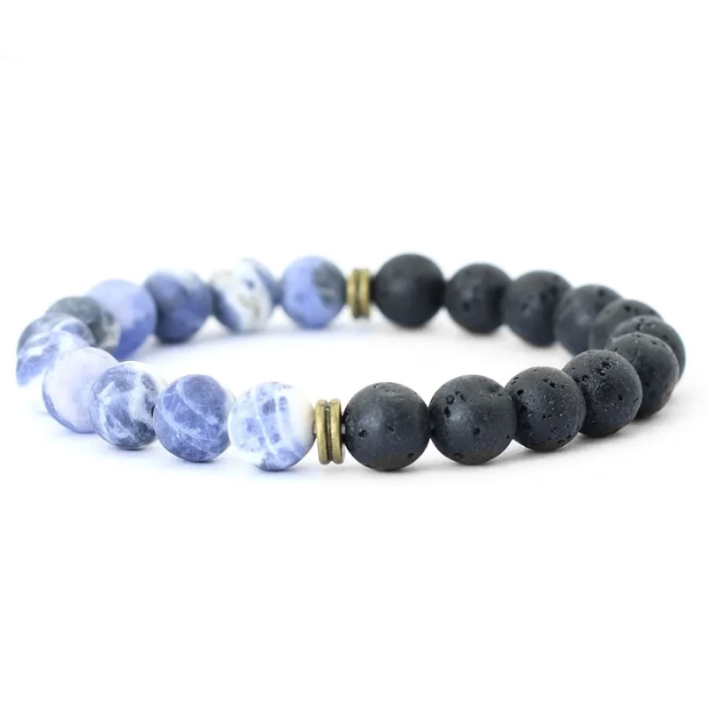 Tento pánský náramek představuje harmonickou kombinaci síly a duchovní rovnováhy, který je ideální pro muže, kteří hledají jak estetický, tak energetický přínos ve svých doplňcích. Náramek je tvořen z 8 mm korálků lávového kamene a zmatnělého sodalitu, navlečených na elastickém lanku o délce 19,5 cm, což zaručuje komfortní nošení a snadné nasazování. Lávový kámen je oblíben pro své uzemňující vlastnosti, které nositeli pomáhají zůstat ve spojení s přírodou a posilují jeho odolnost a odvahu. Sodalit, s jeho klidnými modrými odstíny, je znám svými schopnostmi podporovat intuici a mentální jasnost. Tento kámen je často vyhledáván pro své uklidňující účinky na mysl a emoce, což z něj dělá ideální volbu pro muže, kteří se snaží o vyvážený přístup k životu. Náramek je také designově přizpůsobený pro vrstvení s jinými náramky nebo jako doplněk k hodinkám, což umožňuje nositeli vytvořit osobitý styl. Jeho univerzální a čistý design z něj činí perfektní doplněk pro každodenní nošení i pro speciální příležitosti. Ideální pro muže, kteří hledají šperk, který je nejen módním vyjádřením, ale také zdrojem pozitivní energie a inspirace.