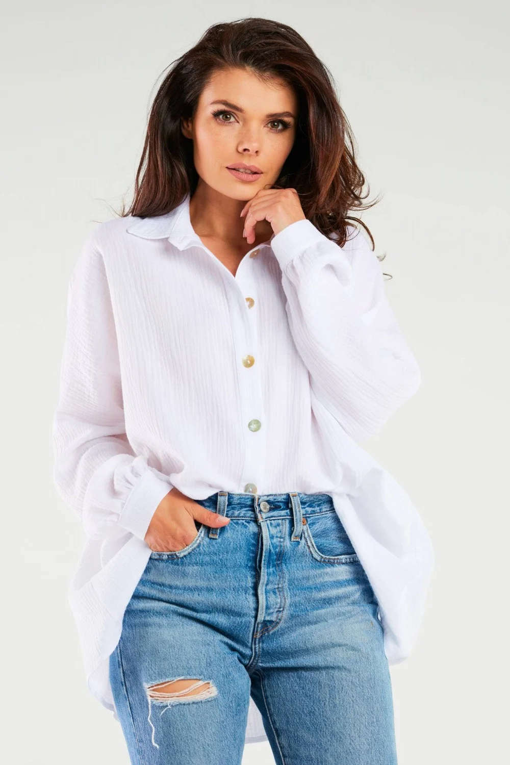 Košile nadměrné velikosti je skutečným must have v ženském šatníku. Model se zapínáním na knoflíky umožňuje upravit hloubku výstřihu podle vašich preferencí. Volný střih zakryje drobné nedostatky postavy a je skvělou alternativou ke klasické košili. Velikost Celková délka universal74 cm