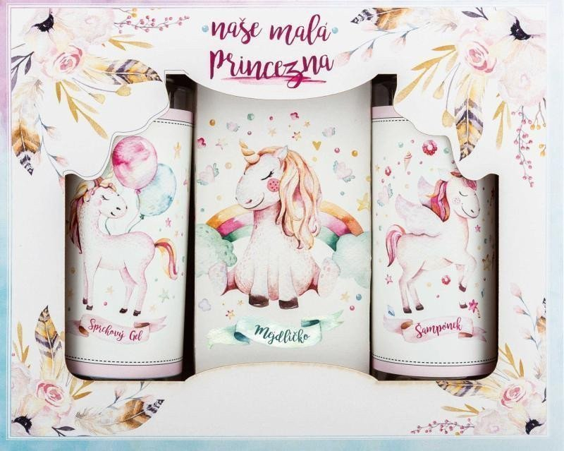 Kosmetická sada pro malou princeznu obsahuje sprchový gel 100 ml, vlasový šampon 100 ml a toaletní mýdlo 100 g. Krásný dárek pro holky s obrázkem jednorožce na etiketách.