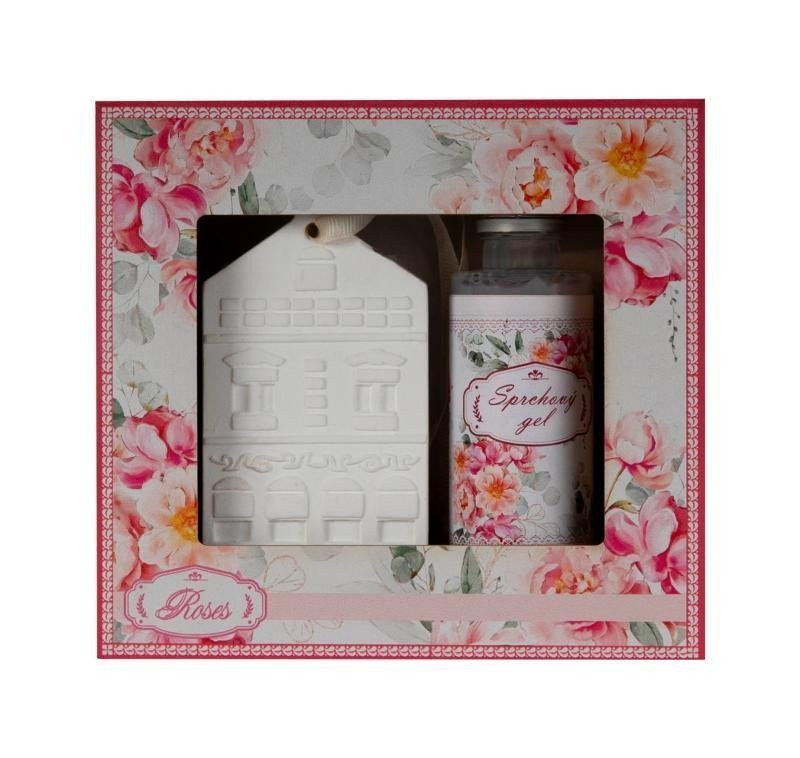 Originální dárkové balení v krabičce zdobené jemným motivem růží obsahující sprchový gel růže 50 ml a parfémovaný vonný kámen ve tvaru domečku.