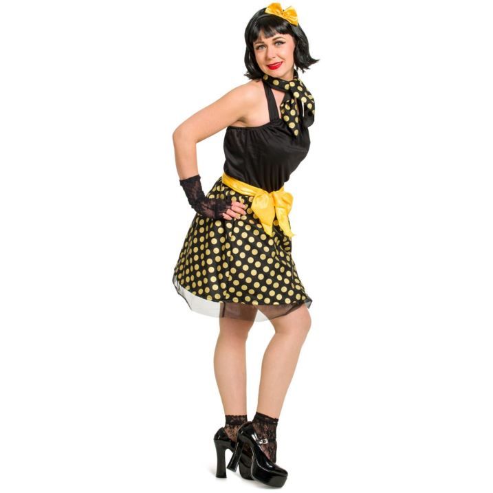 Černé šaty se sukní se žlutými puntíky dodají vašemu vzhledu ten pravý dobový šmrnc.