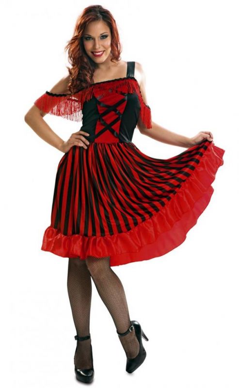 Oživte atmosféru pařížských kabaretů s tímto nádherným kostýmem kankánové tanečnice! Bohaté volány, výrazné barvy a rafinovaný střih zajistí, že budete hvězdou každé retro párty, kabaretního večera nebo taneční show. Kostým je pohodlný a elegantní, ideální pro ty, kteří milují šarm a extravaganci! Červené šaty mají pruhovanou černočervenou sukni s červeným volánem na sponím lemu.Vrchní díl tvoří dojem černého korzetu s ramínky a černým šněrováním s červeným podkladem. Přes výstřih a ramena je flitrová černá stuha s červenými třásněmi. Materiál: 100% polyester