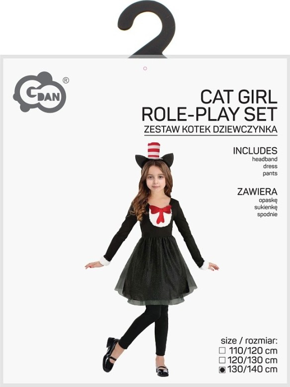 Dětský holčičí kostým Černá kočička velikost 130/140 cm. Kostým obsahuje čelenku s oušky, šaty a legíny.