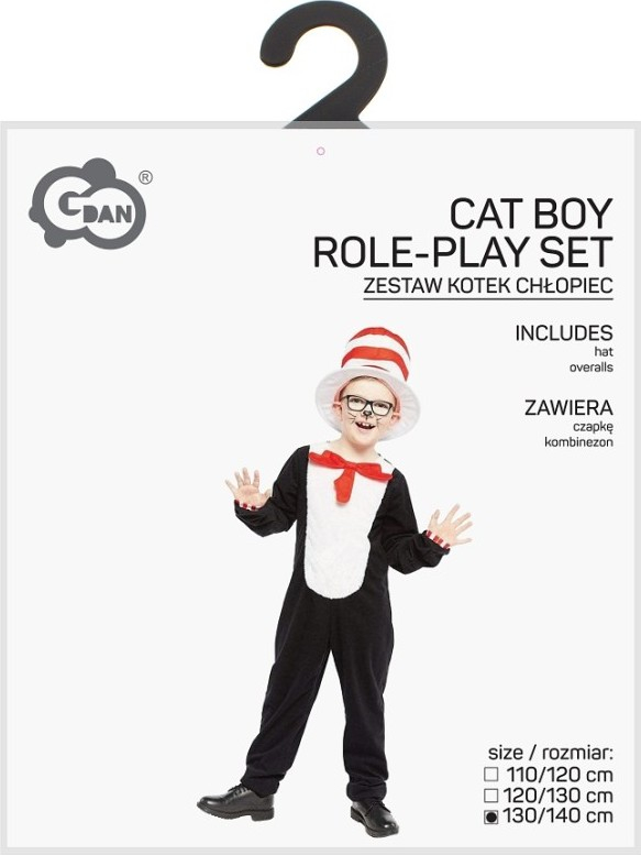 Dětský kostým Černý kocour klučičí, velikost 130/140 cm. Kostým obsahuje kombinézu a klobouk.