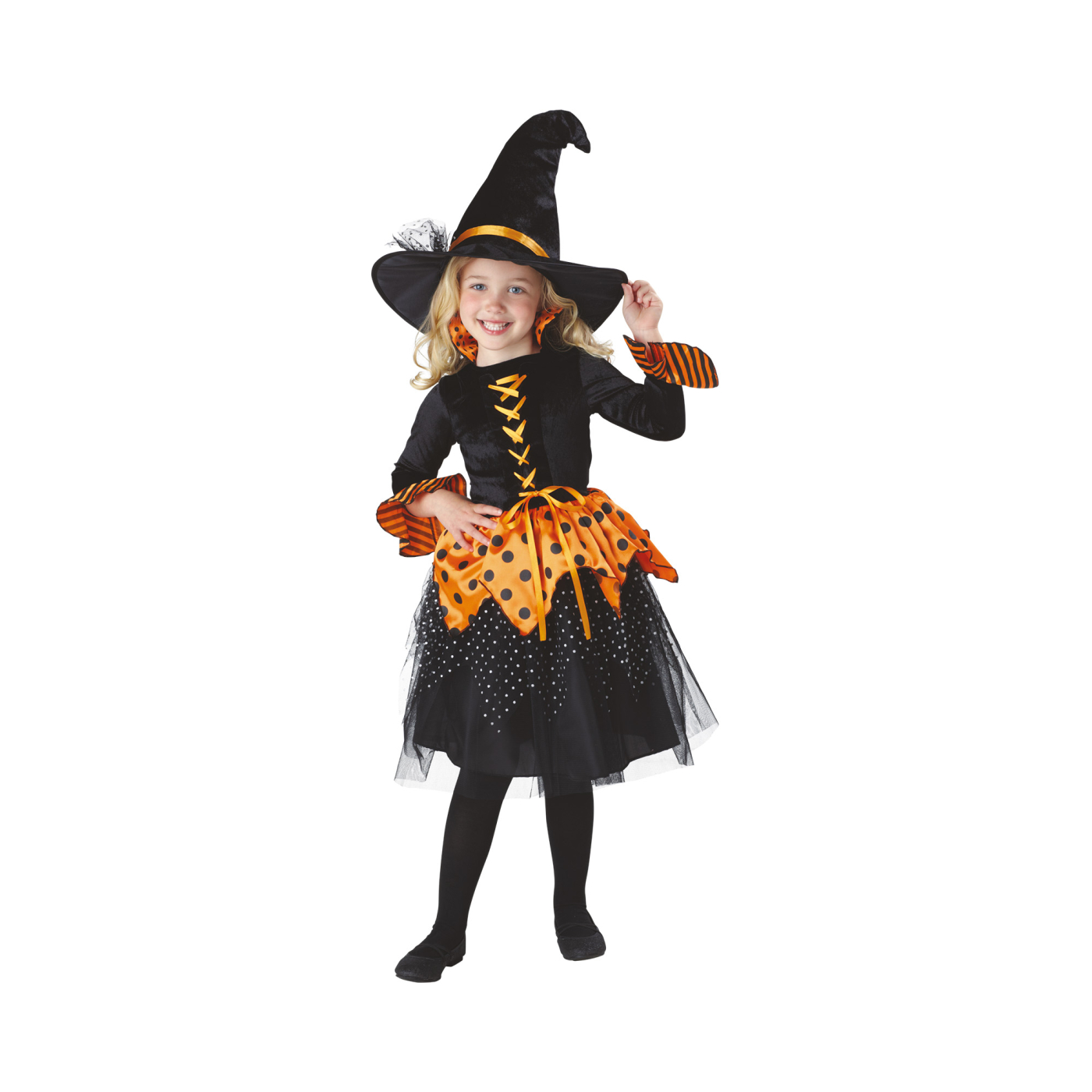 Dětský kostým čarodějky s oranžovo-černými šaty ve velikosti 4-6 let je skvělou volbou na karneval, Halloween nebo pálení čarodějnic. Velikosti: 4-6 let Materiál: 100% polyester Balení obsahuje: skládací klobouk a šaty Nevhodné pro děti do 3 let.