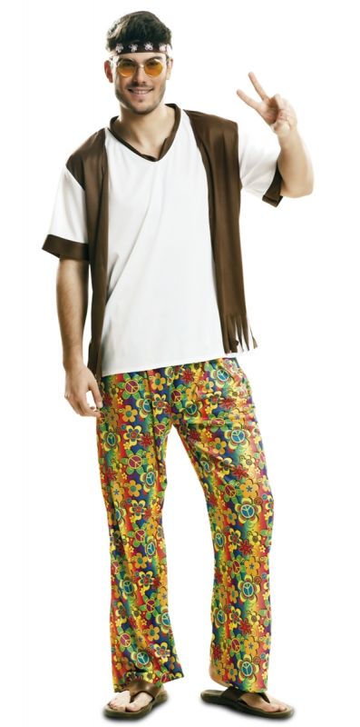 Kostým doplňují barevné kalhoty s výraznými psychedelickými vzory, květy a ikonickými symboly hippie éry.