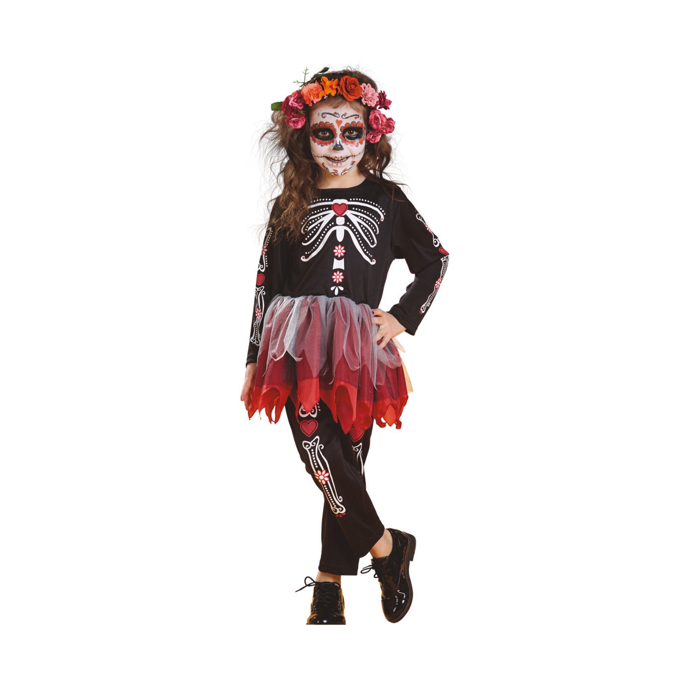 Dětský kostým kostry se sukní ve velikosti 4-6 let je skvělou volbou na karneval, Halloween nebo při oslavě mexického svátku Day of the Dead. Velikosti: 4-6 let Materiál: 100% polyester Balení obsahuje: květovanou čelenku se závojem a overal se sukní Nevhodné pro děti do 3 let.