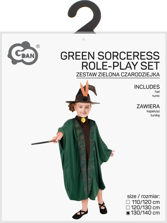 Dětský kostým Kouzelník/Kouzelnice zelený, velikost 130/140 cm. Kostým obsahuje kouzelnický klobouk a kouzelnický plášť.