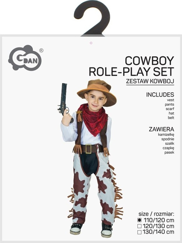 Kostým Kovboj ve velikosti 110/120 cm je dětský karnevalový outfit navržený tak, aby přenesl malého nositele do světa divokého západu. Kostým zahrnuje několik základních prvků typických pro kovbojský styl, mezi které patří vesta, kalhoty, klobouk a opasek. Celkový vzhled kostýmu je doplněn červeným šátkem s tradičním vzorem, který je uvázán kolem krku a dodává celému oblečení autentický nádech. Kalhoty jsou vyrobeny z látky bílé barvy s hnědými skvrnami, které napodobují vzor kravské kůže. Po stranách kalhot jsou připevněné hnědé třásně, jež podtrhují westernový styl a dodávají kostýmu hravý a dynamický vzhled. Vesta je tmavě hnědá a je zdobena stejnými třásněmi jako kalhoty, což vytváří ucelený a koherentní design. Na vestě je také připevněna zlatá kovbojská hvězda, která symbolizuje roli šerifa nebo hrdinného kovboje. Klobouk je světle hnědý s širší krempou a tmavším pruhem po obvodu, což je charakteristický doplněk kovboje a zároveň chrání před sluncem. Opasek je tmavý s velkou zlatou přezkou, která drží kalhoty na místě a zároveň esteticky ladí s ostatními prvky kostýmu. Tento kostým je vhodný pro karnevalové oslavy, tematické párty nebo hry na převleky, kdy umožní dětem ztvárnit postavu kovboje s autentickými detaily a pohodlným střihem.