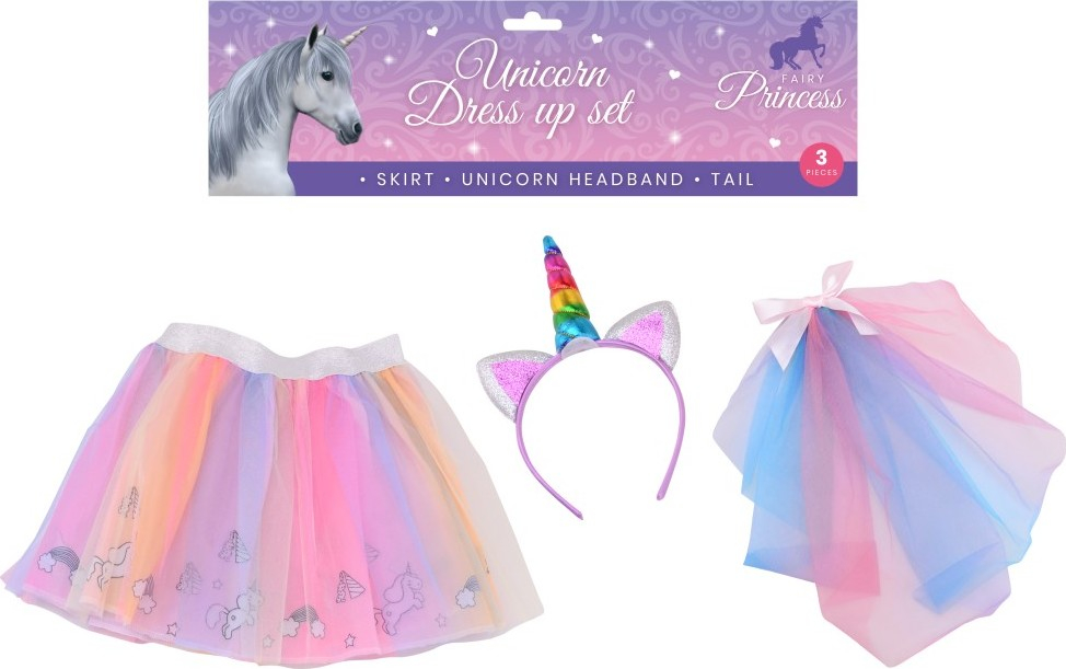 Kostým Jednorožec luxusní – součástí balení vícevrstvá sukýnka s potiskem jednorožce. čelenka jednorožce s rohem a závoj.