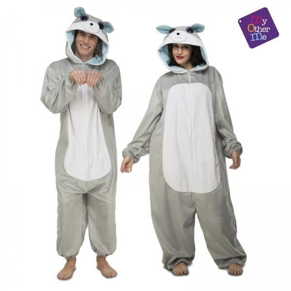 Celotělový overal v šedé barvě je vybaven kapucí s vlčími ušima a ocasem, což dodává autentický vzhled.
