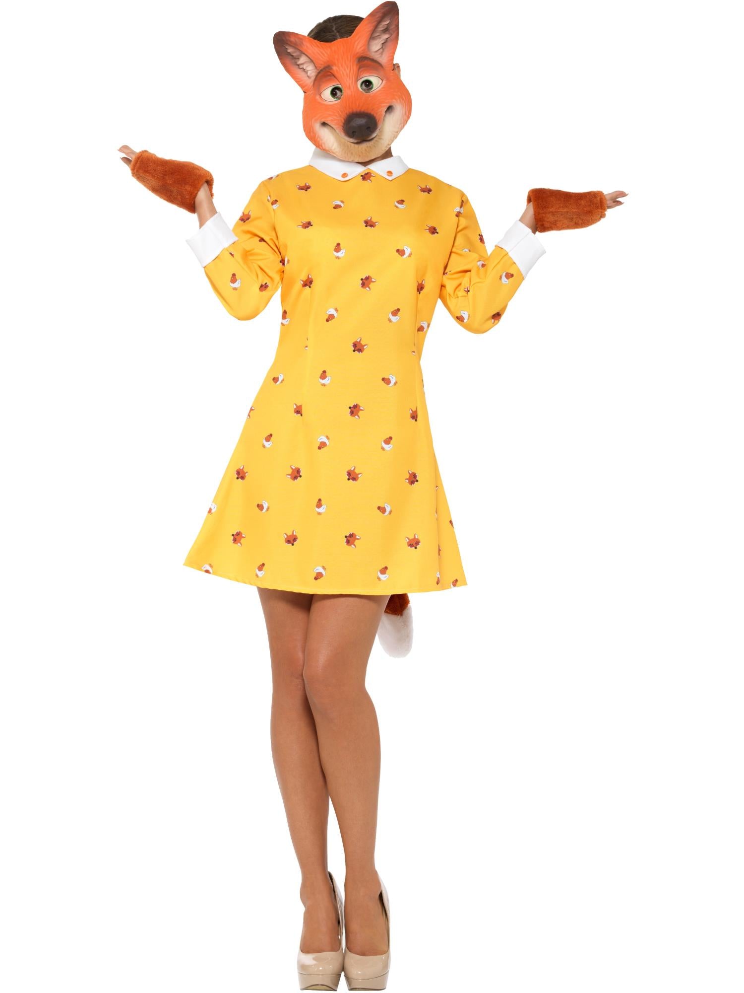 Kostým Lady Fox, žlutý šaty s připojeným ocasem, rukavicemi a maskou EVA