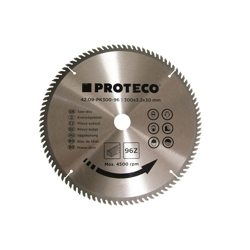 Kotouč pilový SK 300 x 3,2 x 30  96 zubů + redukce 42.09-PK300-96  Proteco - PROTECO - 09-PK300-96 kotouč pilový SK 300x3.2x30 96z + redukce 30/20 mm 42.09-PK300-96. Pilový kotouč 300mm 96zubů představuje vynikajícího pomocníka pro kvalitní dělení měkkého i tvrdého dřeva. Umožňuje řezat či krátit prkna, trámy, hranoly, palubky, latě i další dřevěné tvary, a to příčně i podélně. Pilový kotouč na dřevo o vnějším průměru 300 mm s upínacím průměrem 30 mm, nebo přes redukci 20 mm a šířkou 3,2 mm lze pohodlně umísti například do okružní pily, ruční okružní pily, stolní pily, stolní kotoučové pily a mnoha dalších k tomu určených pil. Pilový kotouč s SK plátky je vyroben z vysoce kvalitní uhlíkové nástrojové oceli, obvod kotouče je lemován 96 střídavě šikmými zuby s SK plátky. SK plátky, tj. plátky ze slinutých karbidů se vyznačují vysokou výdrží a mechanickou odolností.    K tělu pilového kotouče jsou pájeny tzv. sedvičovou metodou, zamezující případnému nežádoucímu odtržení. Pozitivní úhel střídavě šikmých zubů, spolu s úzkým profilem kotouče, garantují klidný chod a bezpečný řez bez nežádoucích vibrací. Pilový kotouč na dřevo je dodáván vyrovnán, nabroušen, vytužen i rozveden a umožňuje tak okamžité použití.