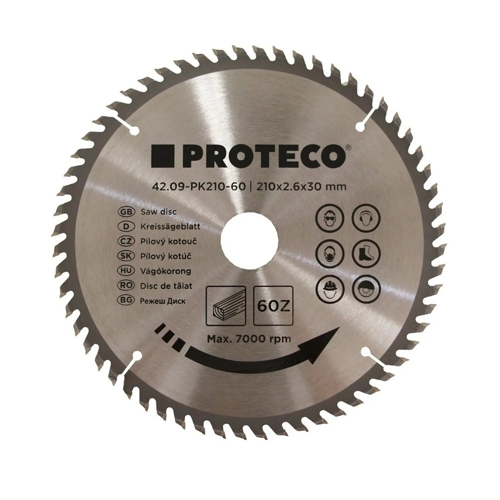 Kotouč pilový SK plátky 210 x 2,6 x 30 mm 60 zubů + redukce 30/20 mm Proteco Pilový kotouč s SK plátky je pomocník pro kvalitní dělení měkkého i tvrdého dřeva. Umožňuje řezat či krátit prkna, trámy, hranoly, palubky, latě i další dřevěné tvary, a to příčně i podélně. Pilový kotouč na dřevo o vnějším průměru lze pohodlně umístit například do okružní pily, ruční okružní pily, stolní pily, stolní kotoučové pily a mnoha dalších k tomu určených pil. Pilový kotouč s SK plátky je vyroben z vysoce kvalitní uhlíkové nástrojové oceli, obvod kotouče je lemován střídavě šikmými zuby s SK plátky. SK plátky, tj. plátky ze slinutých karbidů se vyznačují vysokou výdrží a mechanickou odolností. K tělu pilového kotouče jsou pájeny tzv. sedvičovou metodou, zamezující případnému nežádoucímu odtržení. Pozitivní úhel střídavě šikmých zubů, spolu s úzkým profilem kotouče, garantují klidný chod a bezpečný řez bez nežádoucích vibrací.