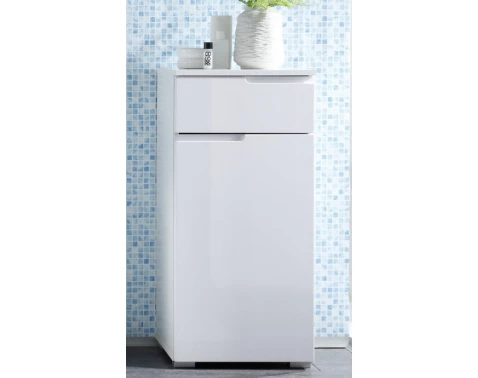 Koupelnová boční skříňka z řady Spice se vyznačuje lesklými bílými povrchy s extravagantní profilací a ideálně se hodí do nadčasově zařízené koupelny.