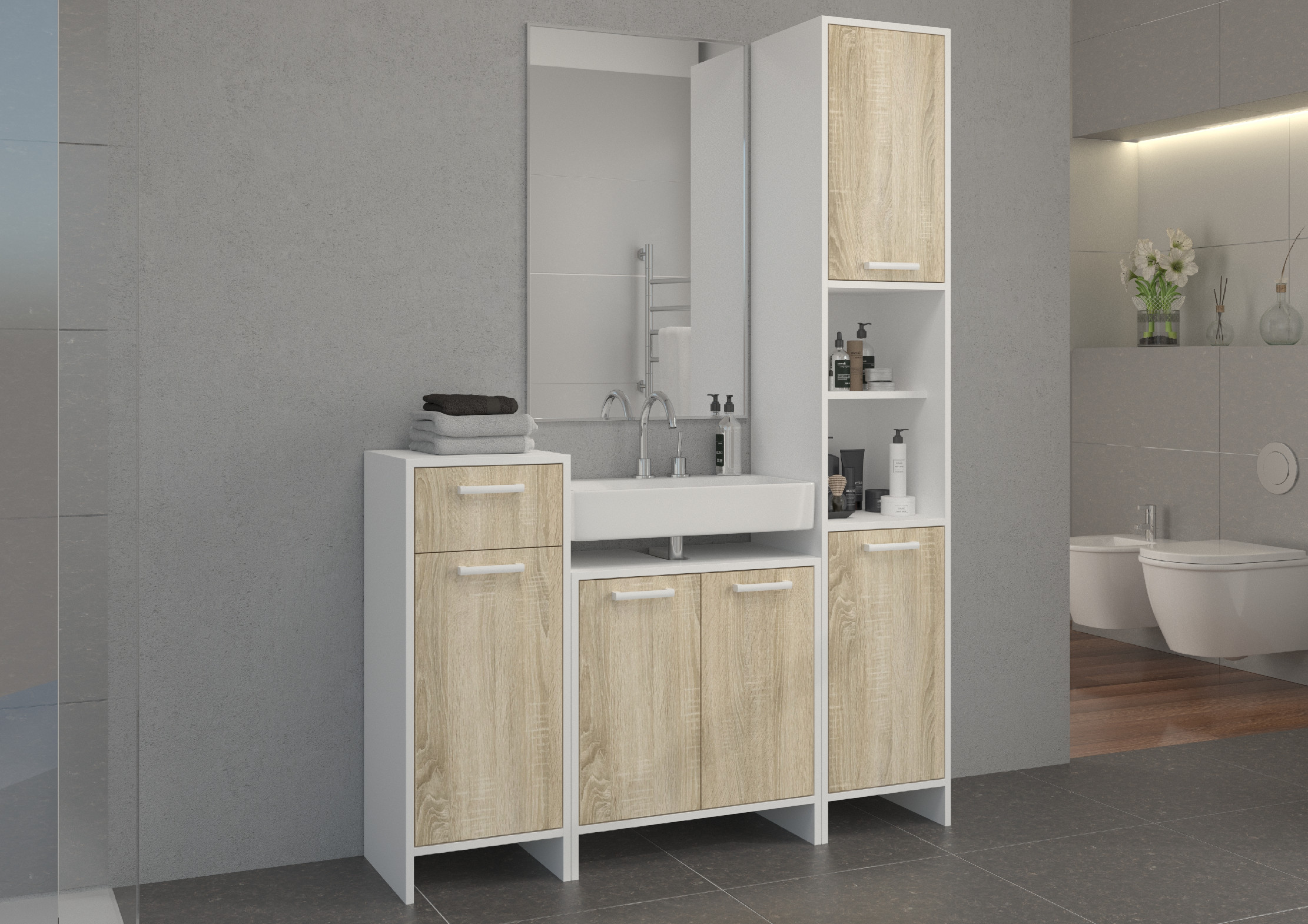Koupelnová sestava Mela II 1 Vlastnosti Materiál Skříňka je vyrobena z laminované dřevotřískové desky o síle 16 mm. Hrany Hrany desek jsou opatřeny ABS lištou. • Barevné provedení Bílá matná Korpus Dub sonoma Dvířka • Komponenty v sestavě a jejich rozměryŠířkaVýškaHloubkaSpodní skříňka Mela II 1F 1S34 cm86,3 cm32,9 cmSkříňka pod umyvadlo Mela II 2F60 cm62,5 cm32,6 cmVysoká skříňka Mela II 2F33,8 cm180,5 cm32,8 cm Spodní skříňka Mela II 1F 1S Skříňka pod umyvadlo Mela II 2F Vysoká skříňka Mela II 2F • UpozorněníOdstíny prezentované na fotografiích jsou ilustračním materiálem, barvy se mohou lišit od vyobrazení na fotografiích podle nastavení vašeho zobrazovacího zařízení.