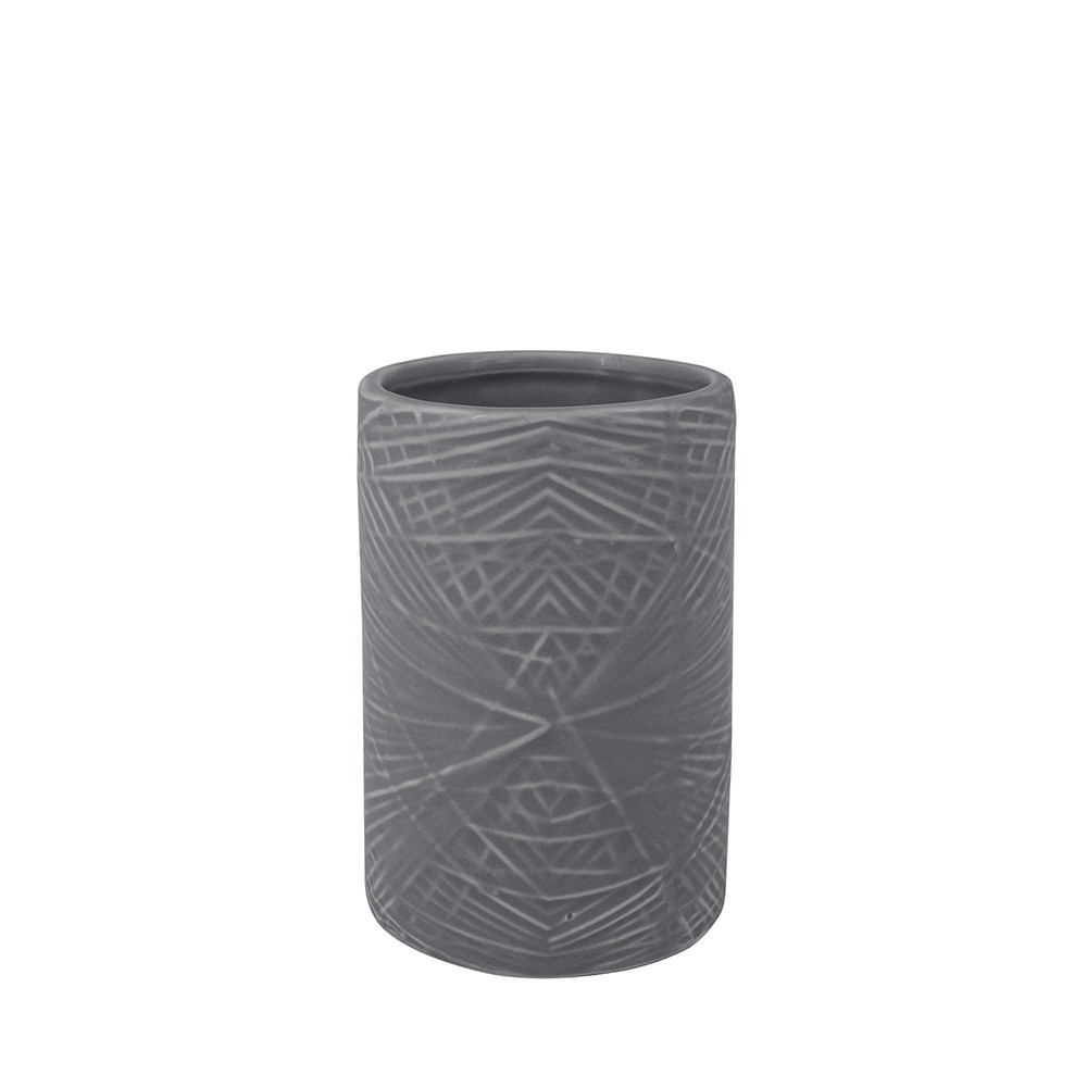 Hrnek na zubní kartáček a pastu Grigio je vyroben z kameniny, vysoce odolné keramiky. Celá koupelnová sestava Grigio je šedé barvy, má lesklý povrch a jemnou pletenou texturu.