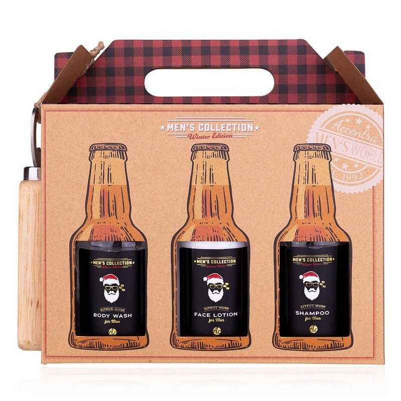 Obsah: 100ml mléko tělové 100ml mléko na ruce 100ml voda pleťová 100ml mléko pleťové 100ml šampon 100ml balzám po holení otvírák s dřevěnou rukojetí Vůně: citrus