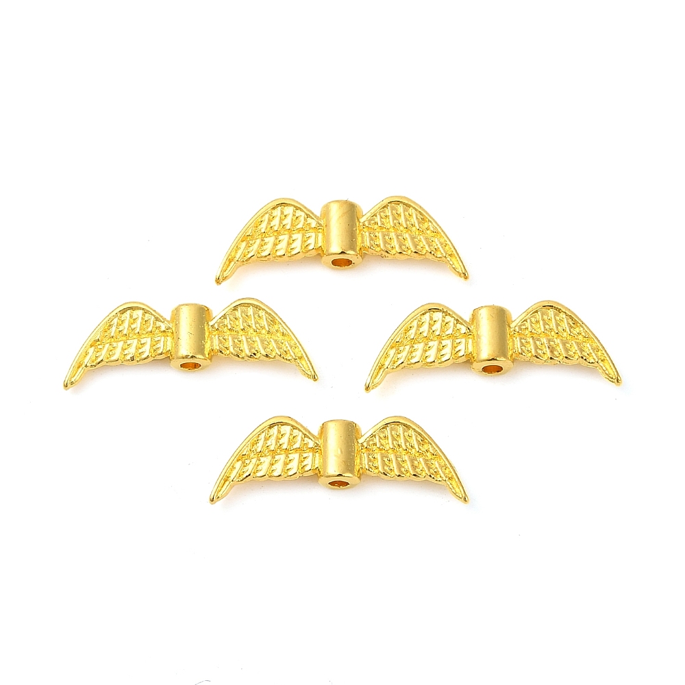 Kovové oddělovací korálky ve tvaru andělských křídel ve zlatém provedení dodají vašim šperkům nádech elegance a jemné symboliky. Každý korálek měří 7,5 × 21,5 × 3 mm a má průvlek o velikosti 1 mm, ideální pro kombinaci s korálky z minerálů, broušeným sklem nebo perličkami. Jsou vyrobeny z bižuterního kovu bez obsahu niklu, olova a kadmia, takže jsou vhodné i pro citlivější pokožku. Zlatý povrch působí luxusně a krásně doplní jak světlé, tak i tmavé odstíny korálků. Andělská křídla symbolizují ochranu, klid a duchovní sílu, proto se perfektně hodí pro výrobu šperků s osobním významem – například náramků, přívěsků nebo vánočních dekorací. Korálky prodáváme po jednom kusu.
