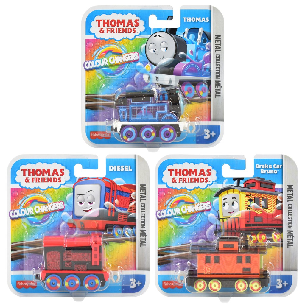 Kovová mašinka Tomáš mění barvu Mašinka Tomáš a jeho přátelé – Mašinka mění barvu na základě teploty vody. Je to jako mít „dvě mašinky v jedné“!Děti ponoří mašinku do teplé vody a objeví se jedna barva/vzhled, a poté ji ponoří do ledově studené vody, aby se objevila barva/vzhled druhý (nebo se odhalila skrytá dekorace).Jde o ručně posouvanou kovovou mašinku, ne o motorizovaný model.Tyto modely jsou kompatibilní s většinou tratí Thomas & Friends (kromě dřevěných). Tři různé typy – Tomáš (hlavní modřá mašinka), Percy (zelená mašinka – Tomášův nejlepší kamarád) a Kana (rychlá žlutá mašinka).