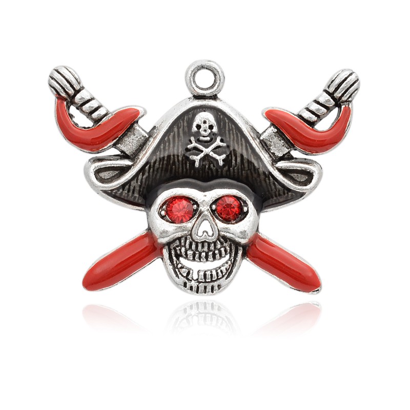 Impozantní kovový přívěsek ve tvaru lebky s očima z červených kamínků, pirátským kloboukem a zkříženými šavlemi, který dodá vašim doplňkům odvážný a dobrodružný vzhled! Tento výrazný přívěsek o rozměrech 34 x 45 x 6 mm s průvlekem o velikosti cca 2,5 mm je ideální pro milovníky neotřelých šperků a pirátské estetiky. Starostříbrné provedení dodává přívěsku vintage nádech a zdůrazňuje jeho detailní zpracování. Vyrobený z bižuterního kovu, přívěsek je nejen stylový, ale také odolný. Součástí je očko na zavěšení, což umožňuje jeho snadné připevnění na řetízek, klíčenku nebo jiný šperkařský projekt. Doporučujeme dokoupit spojovací kroužek ve stejném barevném provedení, aby byl výsledný šperk perfektní. Prodáváme po jednom kusu, což vám dává možnost snadno vytvořit unikátní kousek nebo přidat dramatický prvek do vaší kolekce. Přidejte tomuto přívěsku vlastní příběh a získejte kousek, který neunikne pozornosti! 🏴☠️