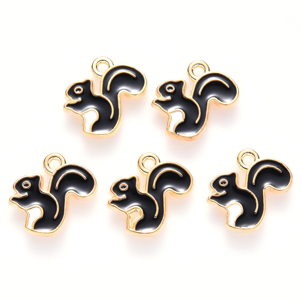 Smaltovaný přívěsek ve tvaru veverky je kouzelným podzimním motivem, který vnese do vašich šperků hravost i nádech přírody. Kombinace světle zlatého kovu a černého smaltu působí elegantně, ale zároveň velmi výrazně. Přívěsek má rozměry přibližně 13 mm na délku, 15 mm na šířku a 2 mm na tloušťku. Průvlek o velikosti 1,4 mm umožňuje snadné zavěšení na řetízek, šňůrku nebo do náramku pomocí spojovacího kroužku. Je vyroben ze slitiny kovů a doplněn smaltovanou výplní, která zvýrazňuje detaily motivu a dodává přívěsku jemný lesk. Veverka je symbolem hravosti, zásob a podzimní atmosféry – skvěle se hodí do tematických kolekcí, přírodně laděných šperků i jako drobný detail pro milovníky lesa a zvířat. Přívěsek prodáváme po jednom kusu. Součástí přívěsku je očko na zavěšení. Doporučujeme zakoupit spojovací kroužek ve stejném barevném provedení.