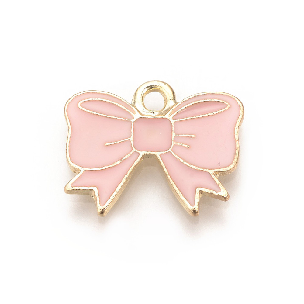 Kovový přívěsek ve tvaru mašličky o výšce 14,5 mm, šířce 17 mm, hloubce 1 mm s velikostí průvleku 2 mm. Přívěsek ve zlatém provedení je vyplněn růžovým smaltem a je vyroben z bižuterního kovu. Přívěsek neobsahuje olovo ani kadmium. Součástí přívěsku je očko na zavěšení. Doporučujeme zakoupit spojovací kroužek ve stejném barevném provedení. Přívěsek prodáváme po jednom kusu.