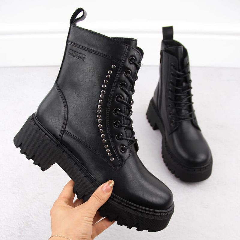 Kožené boty Big Star, zateplené W Vlastnosti: Stylové, elegantní a módní kozačky od renomované značky Big Star zaručují dokonalý doplněk každého ženského outfitu! Boty zateplené kožíškem příjemným na dotek. Krásně lesklé nýty dodají šmrnc každé vaší stylizaci! Model se vyznačuje kulatou špičkou a výškou nad kotník, což výrazně zvyšuje použitelnost. 4 cm silná podrážka a 5,5 cm vysoký blokový podpatek dokonale stabilizují nohu a zajišťují pohodlí při každém kroku. Zapínání na zip a šněrovací detaily zaručují dokonalé přizpůsobení noze. Boty se vejdou do standardní velikostní řady, což usnadňuje nakupování - stačí zvolit velikost, kterou nosíte nejčastěji. Materiál: materiál: přírodní kůže, kožešinová podšívka Colour: černá