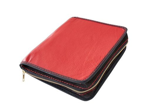 Přírodní kůže, kovový zip, ruční práce. Vhodné pro knihy o maximálních rozměrech: Výška: 22 cm, Šířka (součet 2x šířka + hřbet): 40 cm