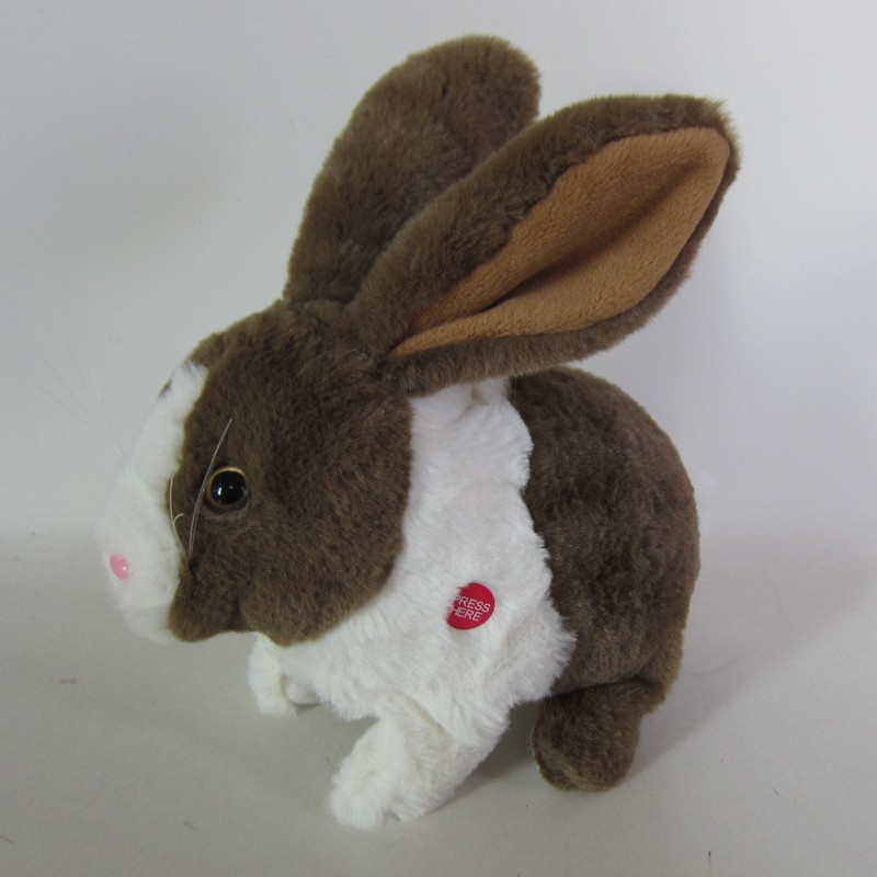 Zajíček – Hnědý.Ušatý kamarád! Roztomilý ušáček se kterým zažijete spoustu zábavy! Zajda hopsá, stříhá ušima a hýbe čumáčkem. tento ušatý kamarád vypadá jako skutečný. Na krku má mrkvičku, kterou když přiložíte špičkou k čumášku, tak zajda jí chroupe.Tento ušatý kamarád je vyrobený z velmi příjemného a kvalitního polyesteru. Tělo zajíčka je vyrobeno ze směsy kovu a PVC.