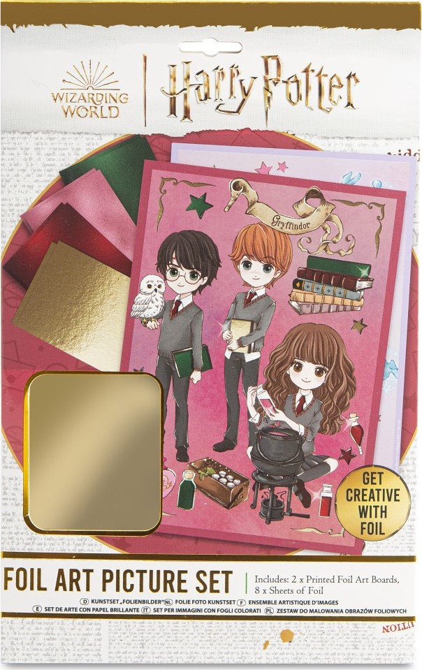 Krativní sada – foliové obrázky Harry Potter – kreativní sada obrázků a nálepek s motivem Harryho Pottera jistě potěší každého milovníka slavného kouzelnického světa. V balení se nacházejí 2 obrázky s motivem Harryho, Hermiony, Rona a Luny. Na těchto obrázcích jsou schovány nálepky, které je třeba najít a po jejich odlepení je nahradit fólií, která je rovněž součástí sady. Výsledkem jsou obrázky s krásnými metalickými odlesky. Balení obsahuje – 2 obrázky s motivem Harry Potte, Hermiony, Rona a Luny a 8 barevných/metalických folií.