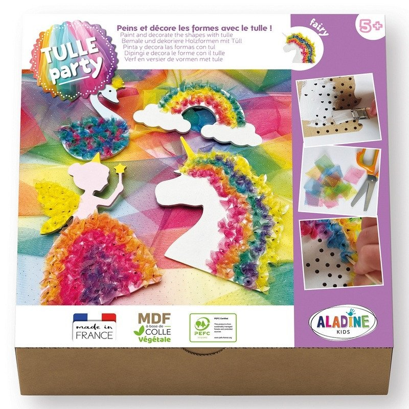 Originální kreativní sada obsahuje všechno potřebné pro hraní s tylem – najdete v ní 4 dřevěné výřezy, které se nabarví 8 přiloženými barvičkami. Zatímco výřez schne, nastříhejte si duhově barevnou látku na menší díly o velikostech kolem 2 x 2 cm až 3 x 3 cm. Pomocí špejlí čtverečky tylu zastrkávejte do dírek ve výřezu – můžete následovat vzor na balení nebo tvořit dle vlastní fantazie! Jde o nezvyklé a originální kreativní hraní podporující představivost, soustředění a jemnou motoriku, také nabídne dětem možnost seznámit se s látkou a dřevem jakožto kreativními materiály. Barvy jsou na vodní bázi. MDF pochází z ekologicky získaného zbytkového dřeva. Vhodné pro děti od 5 let.